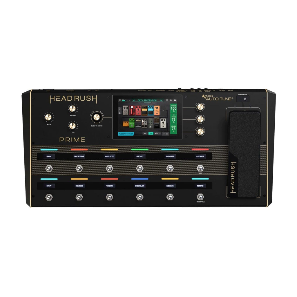 HeadRush Prime El modelador de efectos/amplificador/procesador vocal de guitarra más potente. Con un procesador multinúcleo avanzado con una enorme biblioteca de efectos de guitarra integrados, emulaciones de amplificador, cabina y micrófono, clonación inteligente de amplificador/pedal y carga IR, el mejor looper de su clase y un conjunto completo de efectos vocales (que incluye el Antares Auto-Tune estándar de la industria), el HeadRush® Prime es el procesador de efectos de piso más potente, versátil y con un sonido realista jamás creado. La pantalla de alta resolución y ultra sensible de 7 pulgadas le permite tocar, deslizar y arrastrar y soltar para crear y editar instantáneamente sus equipos de una manera fácil de usar sin precedentes. Características principales Pantalla táctil de alta resolución de 7 pulgadas con interfaz intuitiva Modelado realista y receptivo de amplificadores, gabinetes y micrófonos, incluidos todos los modelos nuevos de Revalver, el innovador reconocido del software de modelado de amplificadores de guitarra. Preajustes de guitarra y bajo de ChopTones Amplia biblioteca de efectos de guitarra y voz, incluido Antares Auto-Tune® Amp Cloner captura el sonido de su amplificador, preamplificador, pedal de distorsión, pedal de overdrive o pedal de fuzz favorito Conexión Wi-Fi directa a HeadRush Cloud para compartir clones, compartir preajustes y actualizaciones de firmware La herramienta de práctica de transmisión de música Wi-Fi hace que aprender canciones sea más fácil que nunca Conectividad de audio Bluetooth para tocar con dispositivos móviles Potente sistema DSP multinúcleo de diseño personalizado con conmutación preestablecida sin pausas Chasis de acero listo para la carretera con pedal de expresión incorporado duradero y fuente de alimentación universal 12 interruptores de pie con LED de colores personalizables y pantallas de visualización de tiras de OLED Importe archivos IR de gabinete de guitarra y bajo virtualmente ilimitados Bucle de efectos estéreo para integrar pedales de efectos externos y conectividad de método de 4 cables El mejor looper de su clase con función de guardar/cargar y sincronización MIDI Grabe y vuelva a amplificar a través de la interfaz de audio USB integrada (hasta 24 bits/96 KHz)